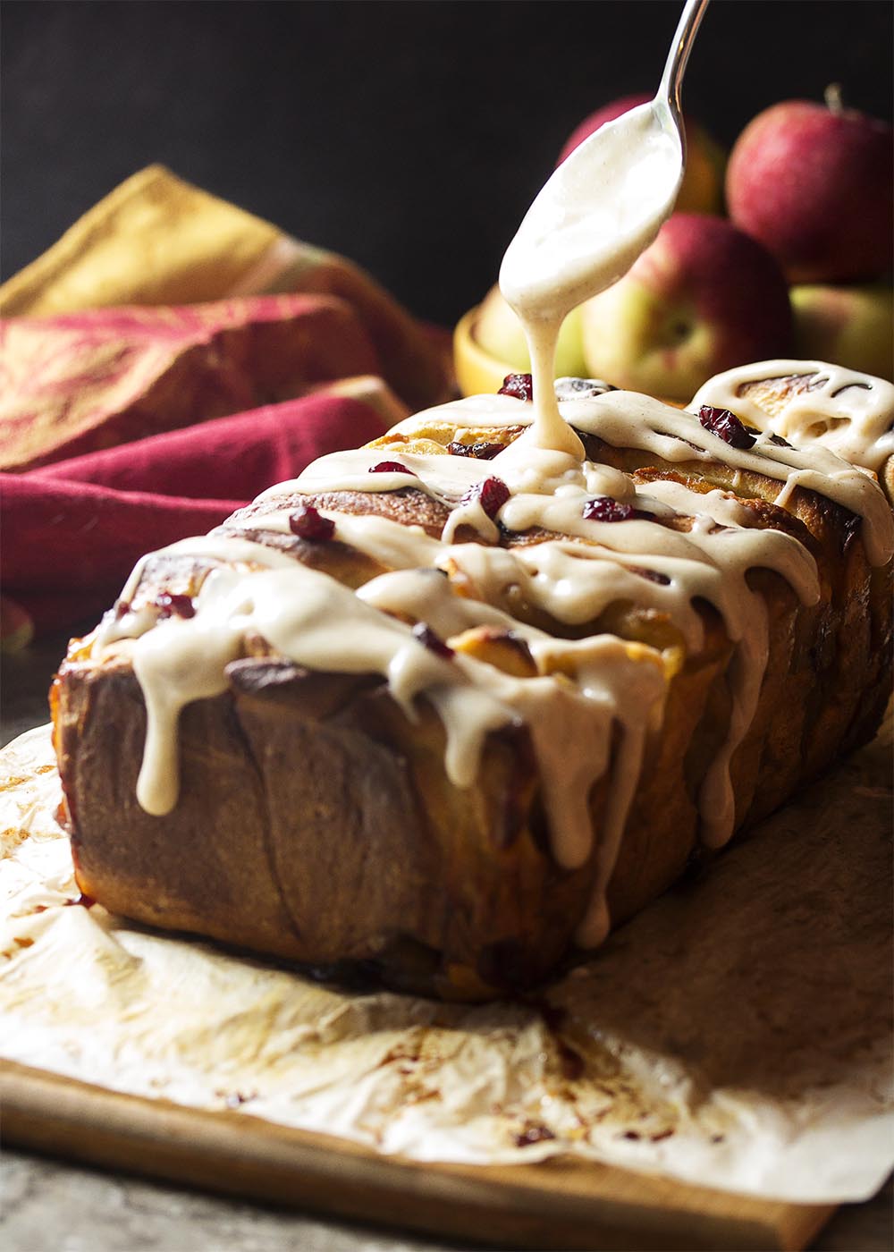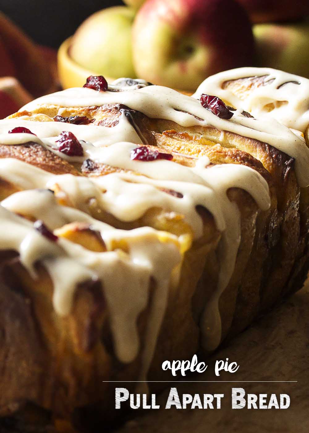 Apple pull apart bread! Apple pie filling and bourbon soaked cranberries all sandwiched between layers of sweet bread dough and then topped with a cider glaze. That’s what I’m talking about. It’s messy and yummy and you need to go get some apples to make this right now.