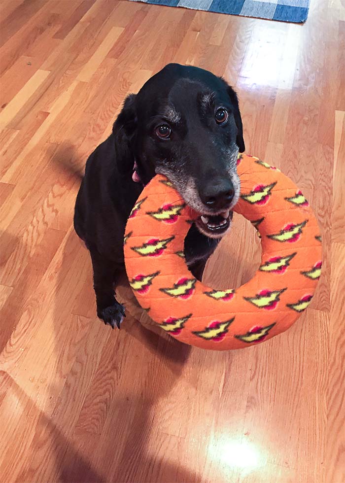Ginny doesn’t have many toys, mainly because she chews right through them, then there is stuffing everywhere and we need to grab the squeakers before she eats them. Fun times. So, when I saw a no-stuffing, the whole thing is squeakers (no spot to chew specifically), level-10 dog toy in the local pet store I had to get it.
