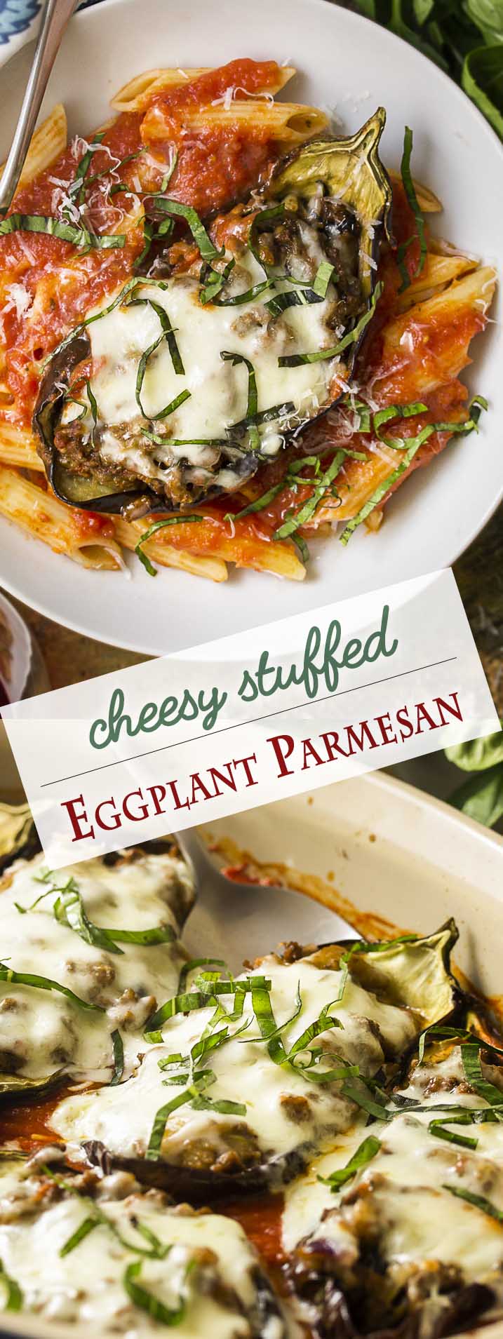 Gooey, cheesy, and surrounded by marinara sauce. My stuffed eggplant parmesan is satisfying Italian American comfort food full of great flavors just right for Sunday dinner…or any other night.
