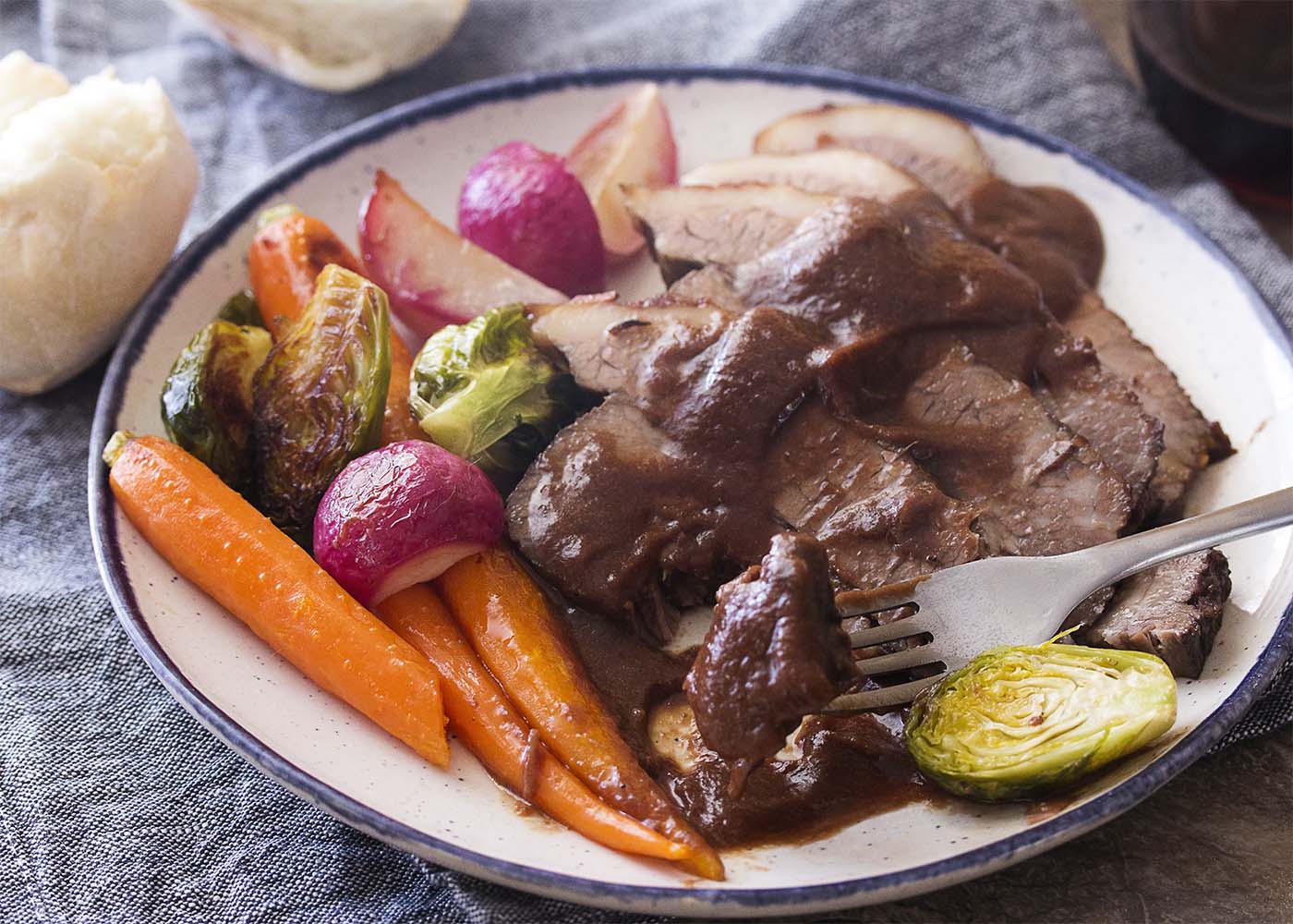 Holiday dinners are enough work that you don’t want a fussy main course! My braised beef brisket not only can be made the day before, but it’s even better that way. All you need to do the day of is slice the brisket, add some mixed veggies to the pan, and then warm up the brisket and gravy. No fuss.
