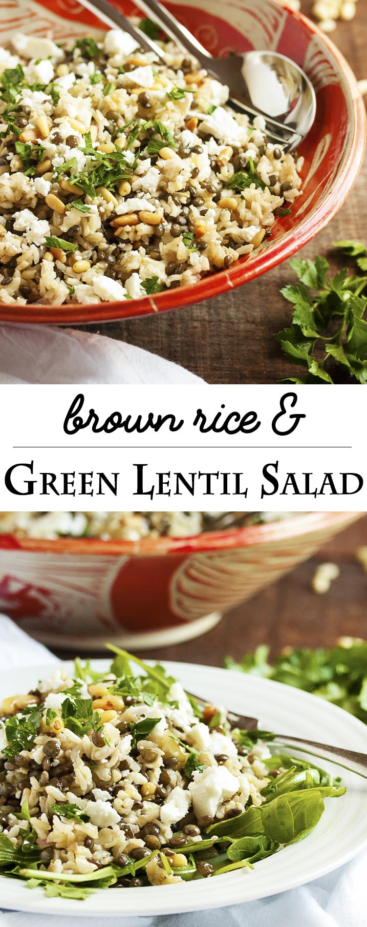 Earthy lentils, brown basmati rice, buttery pine nuts, creamy feta, and spicy arugula. That is a lot of awesome in one bowl! This rice and lentil salad is both good and good for you, an excellent combo. And it’s flexible enough to work as a side along with a meat course or as a main for a vegetarian meal.