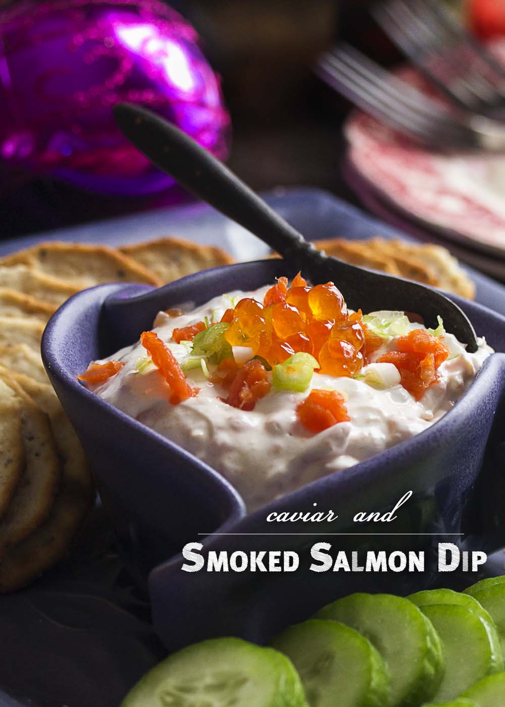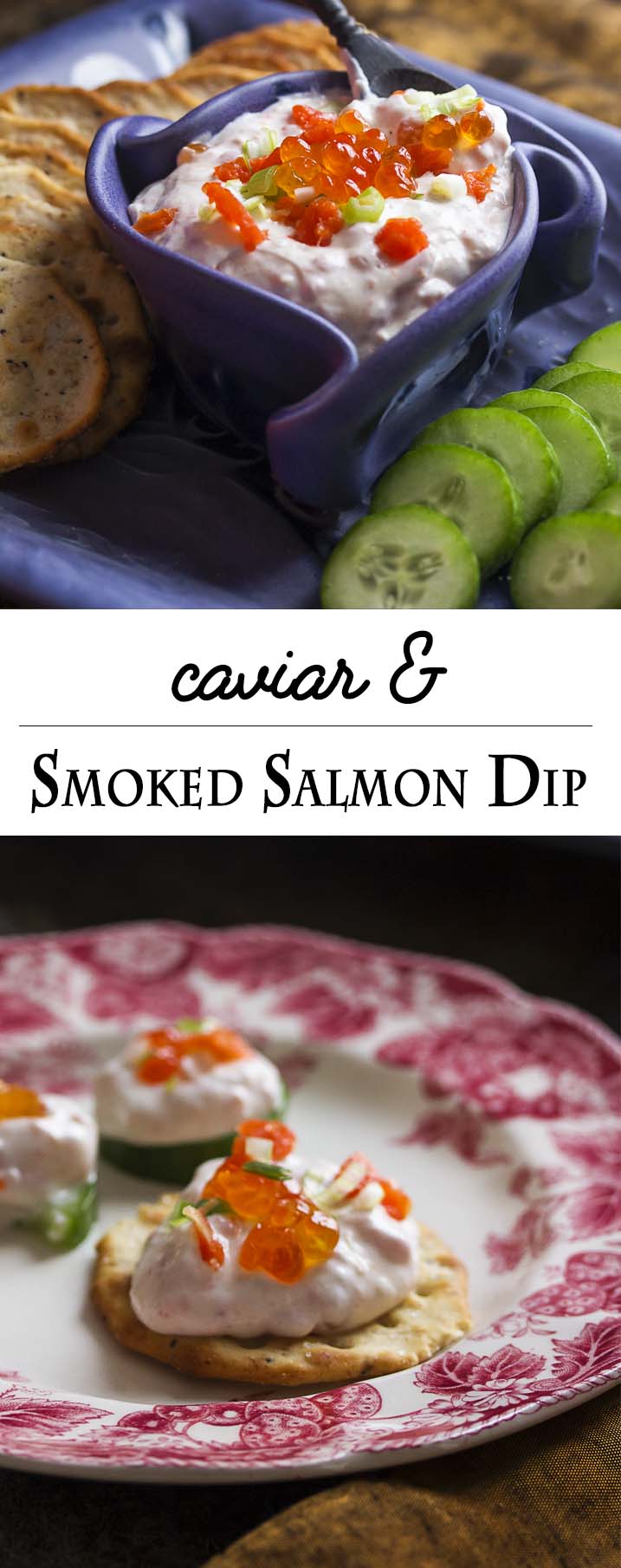 When I made this recently, my daughter and I polished off a good portion of the dip as soon as I put away my camera. We were like ravenous wolves! It’s smelled so good and we knew how tasty it was, so that the dip didn’t stand a chance. It’s this great combination of creamy cheese, spicy horseradish and scallions, smoky and rich salmon, and the wonderful salty pop of caviar. Pair it with cucumbers (my daughter’s favorite) or crackers and then stand back and watch your guests demolish the platter.