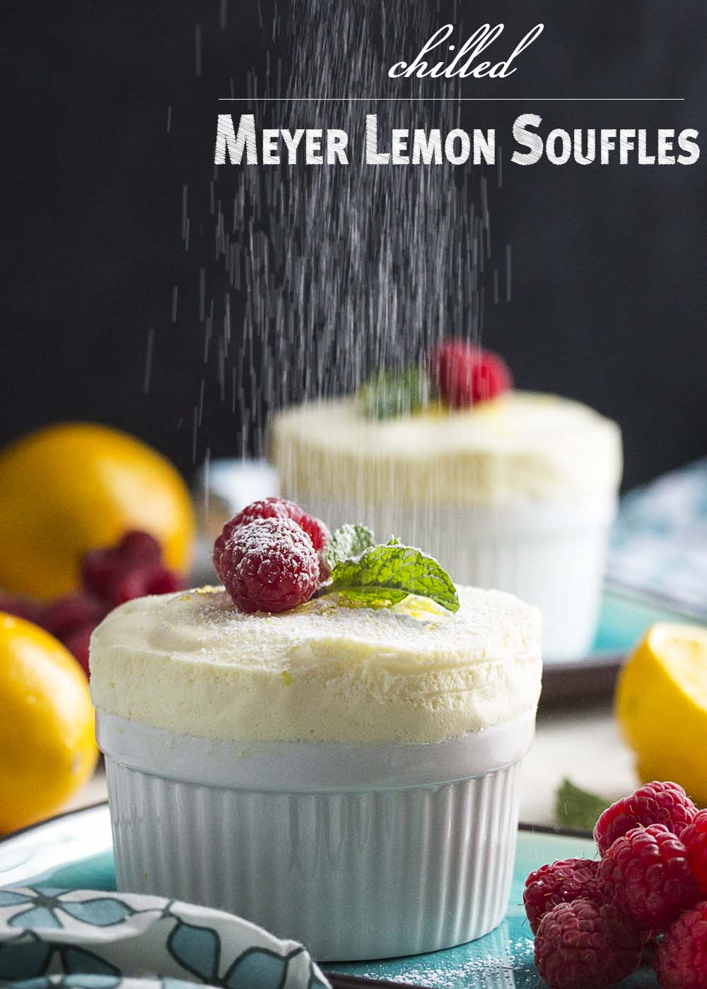These no-bake chilled lemon souffles are so airy and light tasting! I love Meyer lemons and couldn’t wait to finally see them in the market this year so I could share this dessert with you. They give the souffles such a complex, floral flavor which pairs well with the vanilla and raspberries. Yum! And I love that they can be made ahead of time and pulled out when it’s time for dessert.