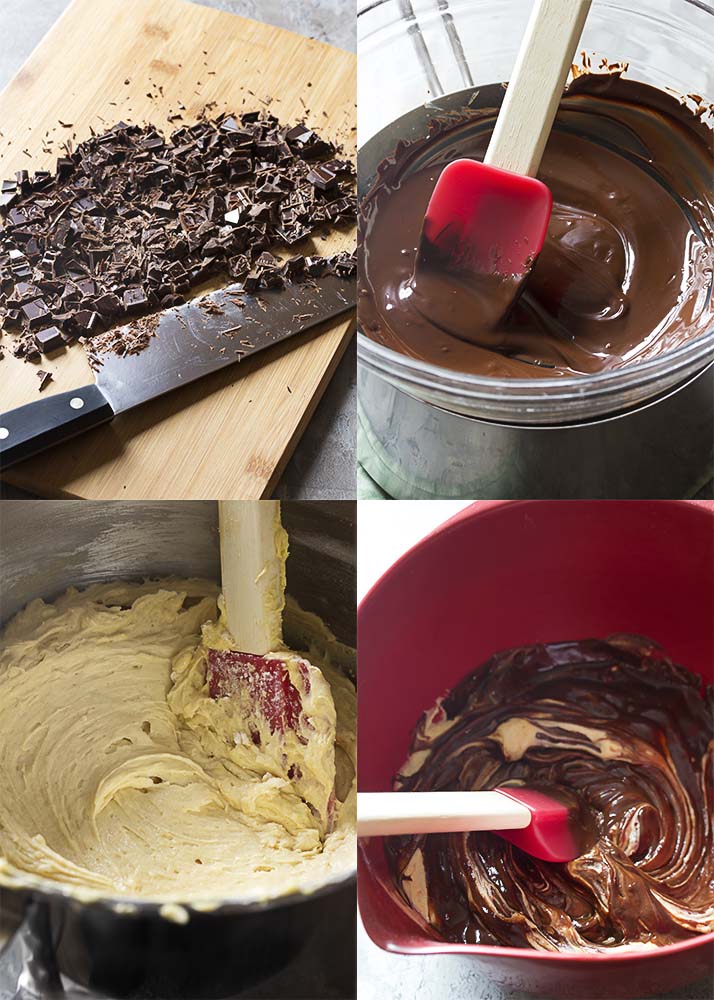 Just melt some chocolate and take a couple of cups of the yellow batter and mix it together. Done! You’ll have a thick and chocolatey cake batter full of yummy bittersweet chocolate.