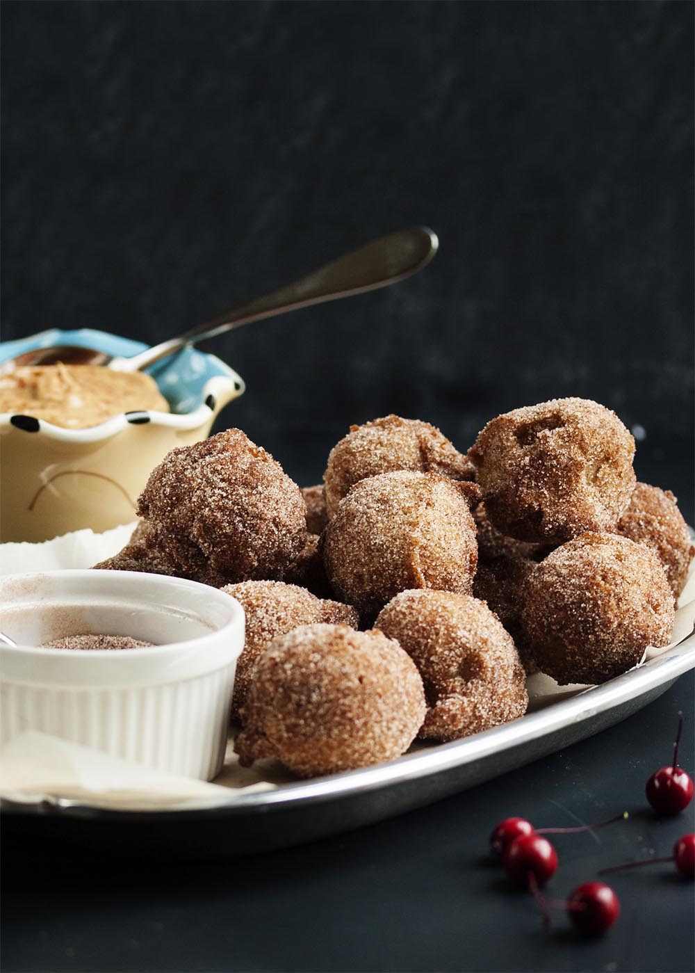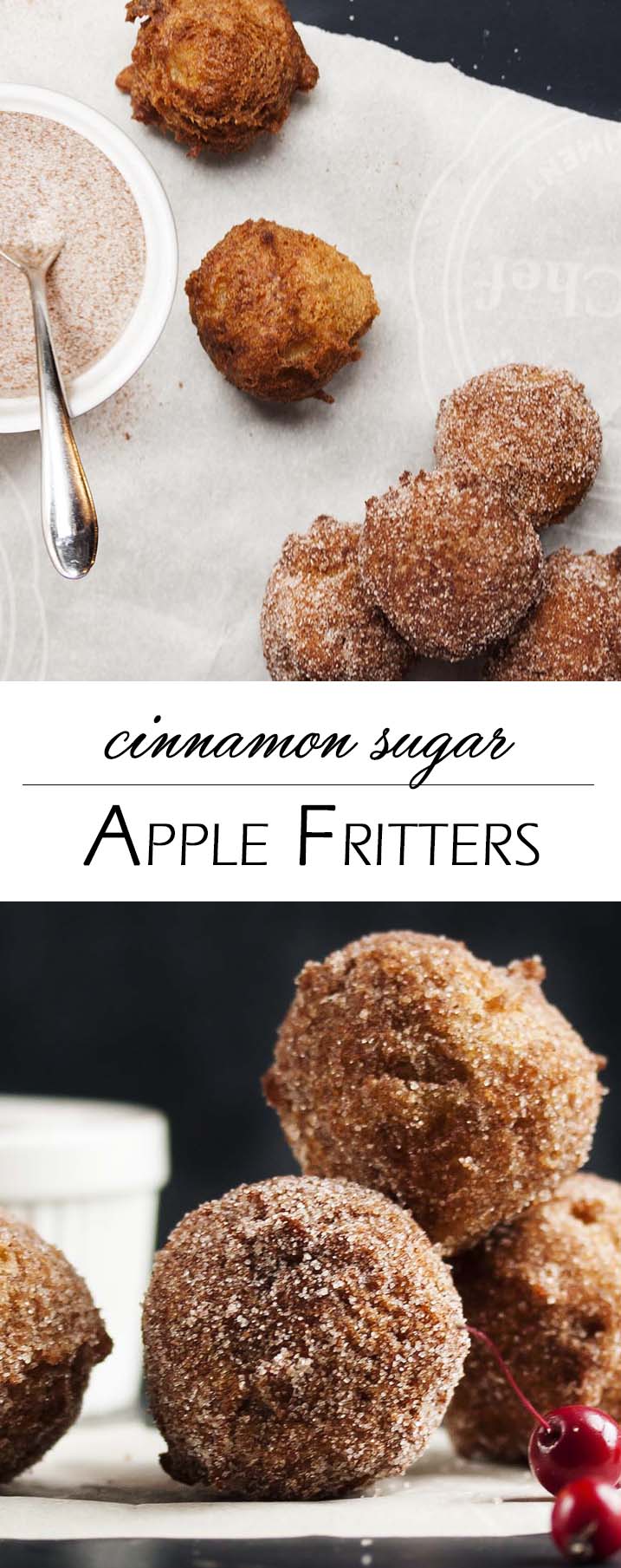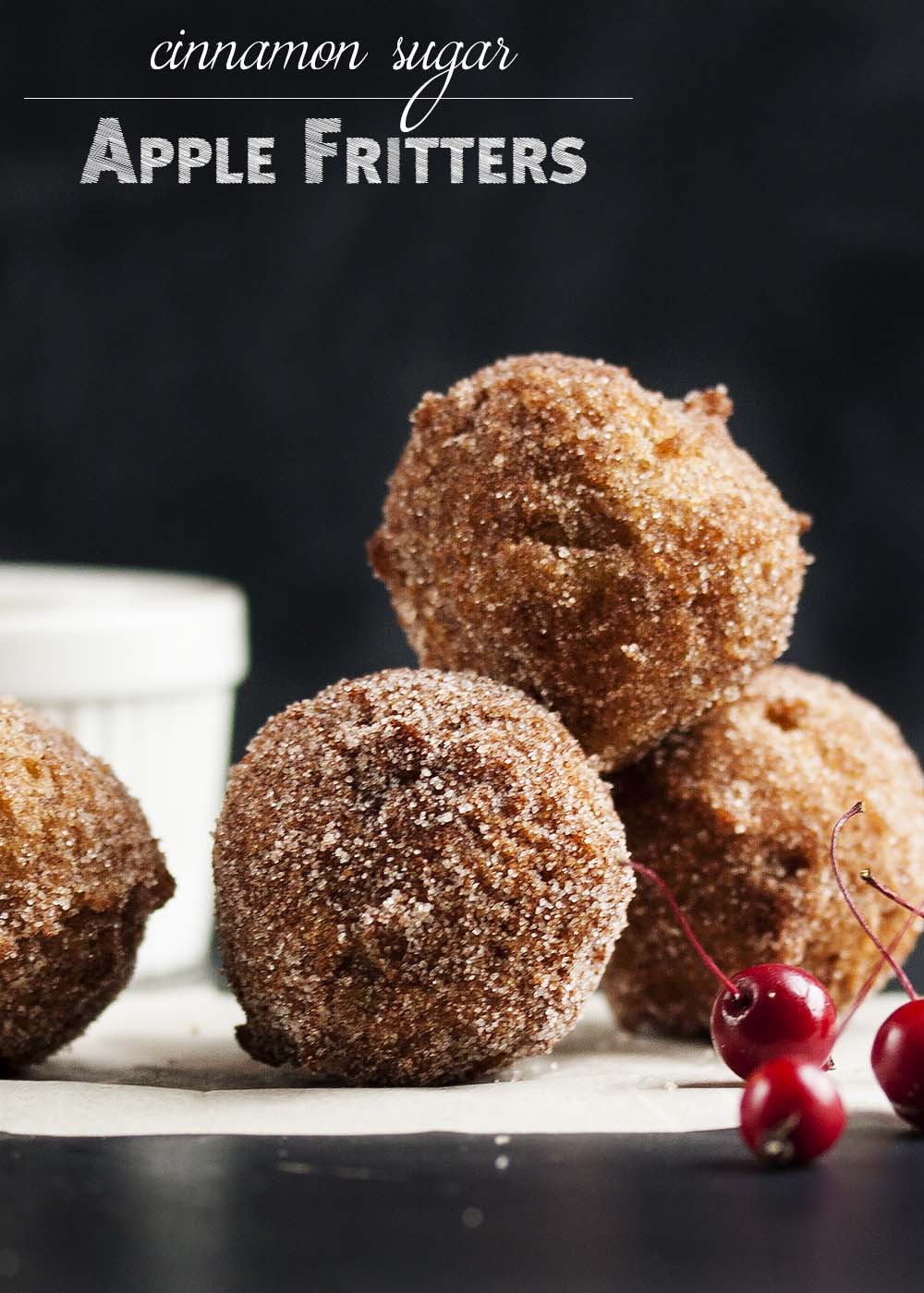 Diced apples surrounded by a light and tangy buttermilk batter, deep fried for a few minutes until golden brown and then rolled in cinnamon sugar! These little apple fritters are awesomely tasty and small enough that you can have one…or two.