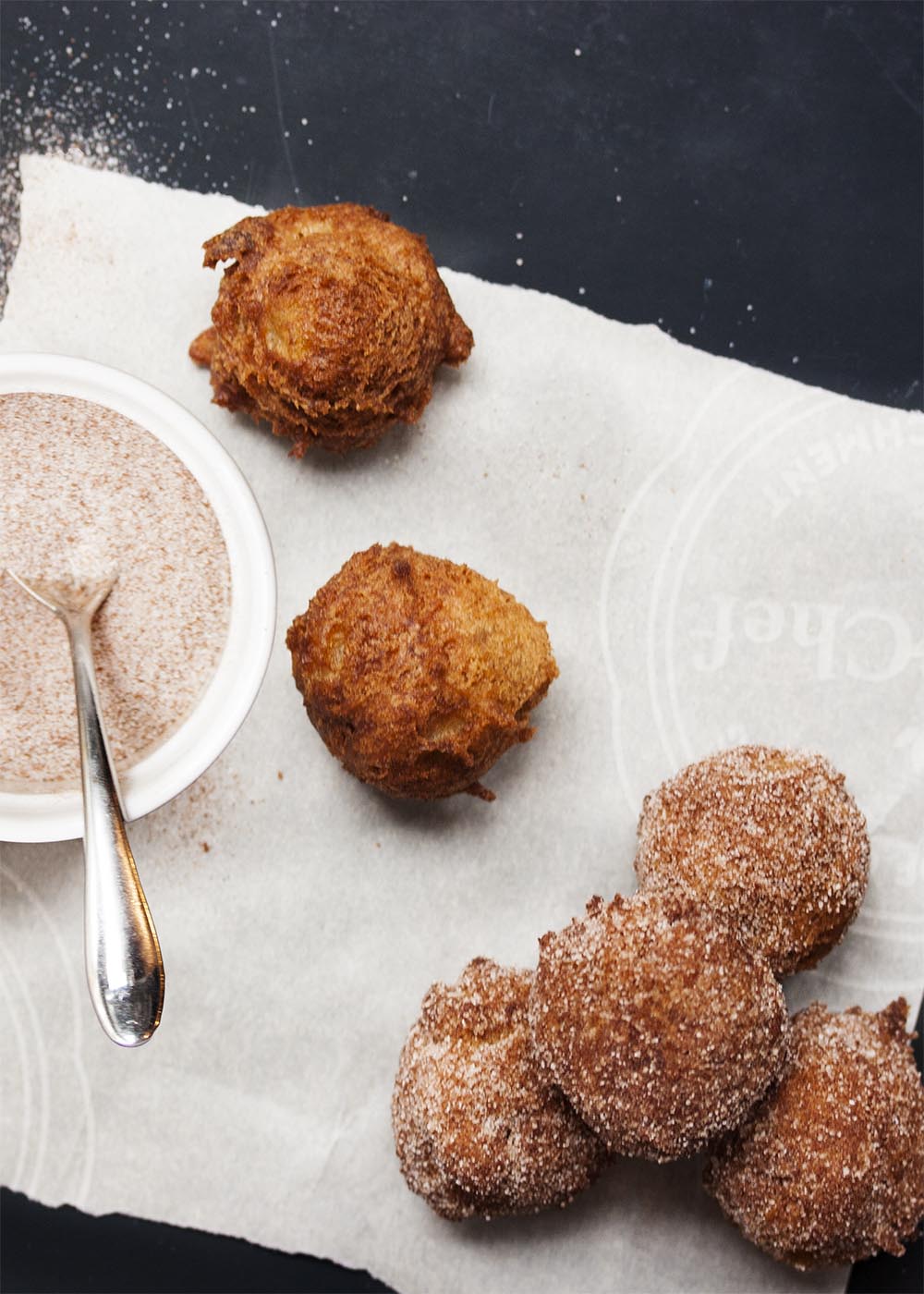 - Scoop out the fritters using a slotted spoon or wire skimmer, letting them drain for a moment before moving them to the towel lined plate. Add the next batch of fritters to the oil. While they are cooking, roll the finished fritters in the cinnamon sugar and put them on the cooling rack.