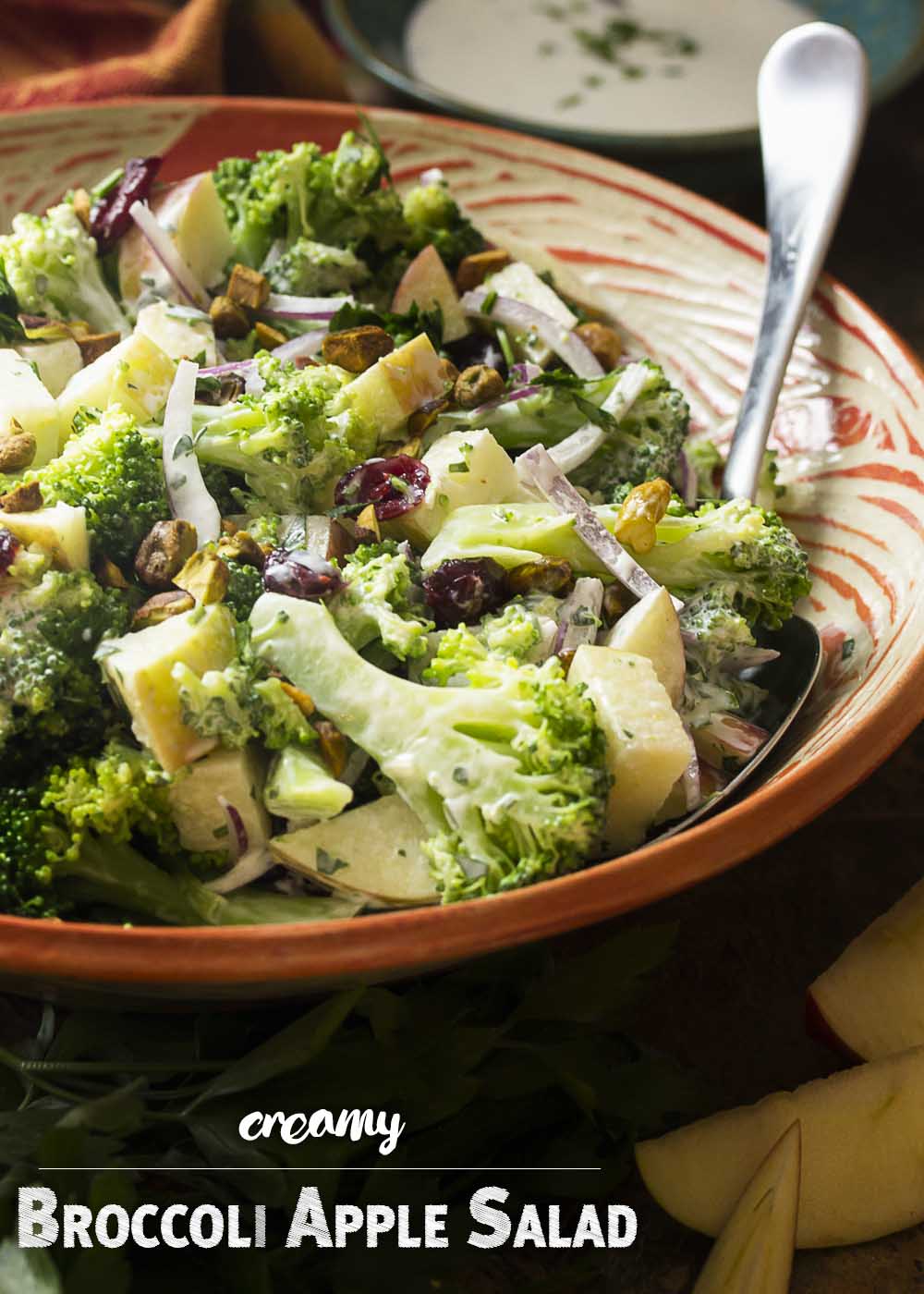 Creamy Broccoli Apple Salad with Pistachios, Cranberries, and Red Onion