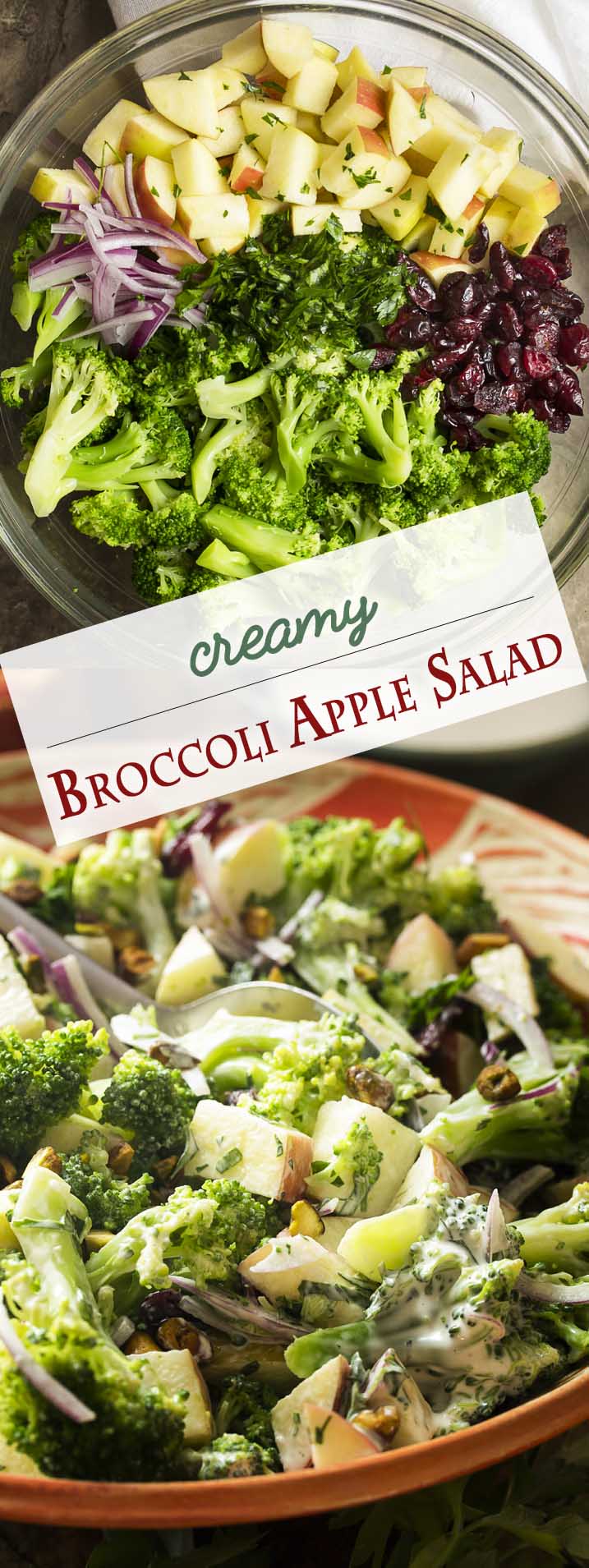 - Combine the broccoli, apple, onion, parsley, and cranberries in a large bowl. Pour about 1/2 of the dressing over the salad and toss to mix it well. Transfer the salad to a serving bowl. Top with the pistachios just before serving. And serve with the remaining dressing on the side.