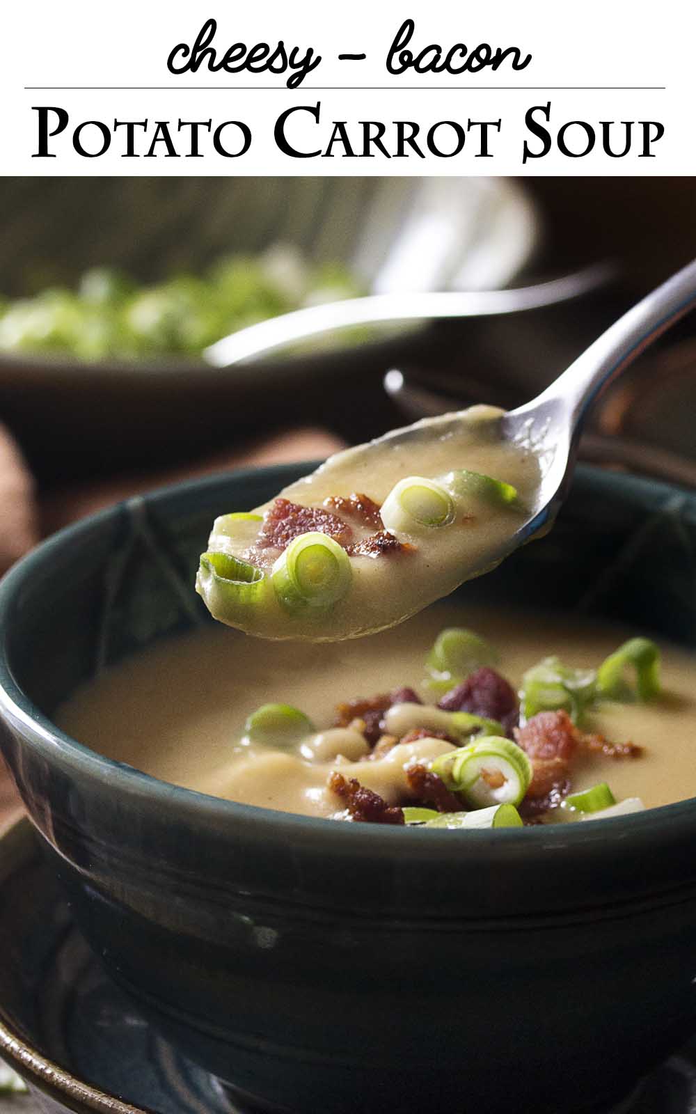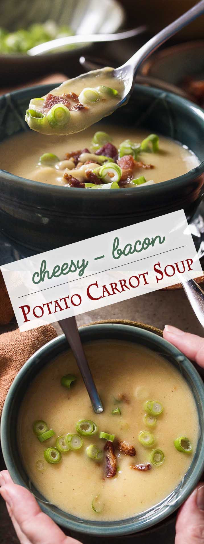 Thick and cozy, potato carrot soup is soul warming comfort food! Add in a good dose of sharp cheddar cheese and…just a little bit of bacon, and you have a satisfying winter dinner on the table in about 45 minutes.