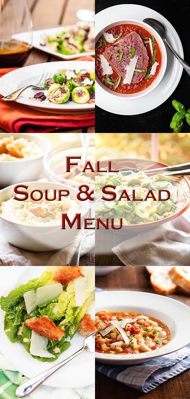 I don’t know about you, but once September hits I’m thinking about cozy foods and homey, satisfying dinners. Which makes this a great time to feature a soup and salad menu! This month’s fall menu has three of my homey, comforting soups, each paired with a great and tangy salad to make for a weeknight meal perfect for those chilly nights to come.