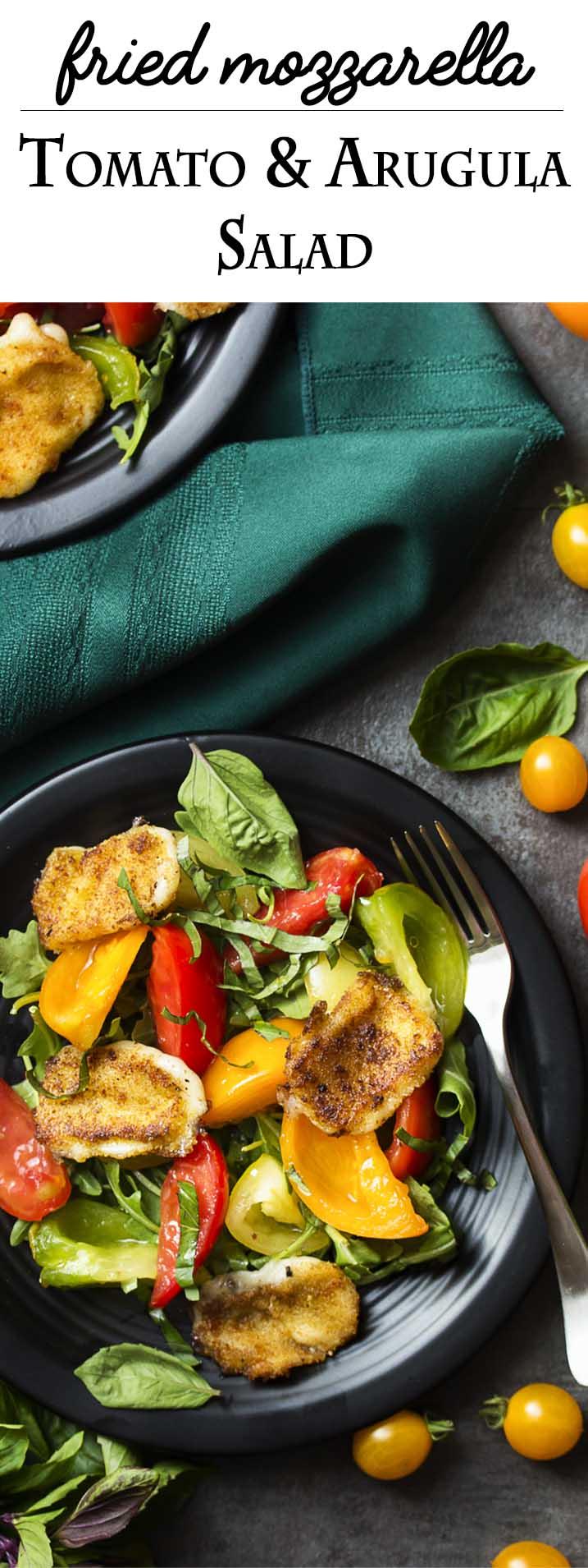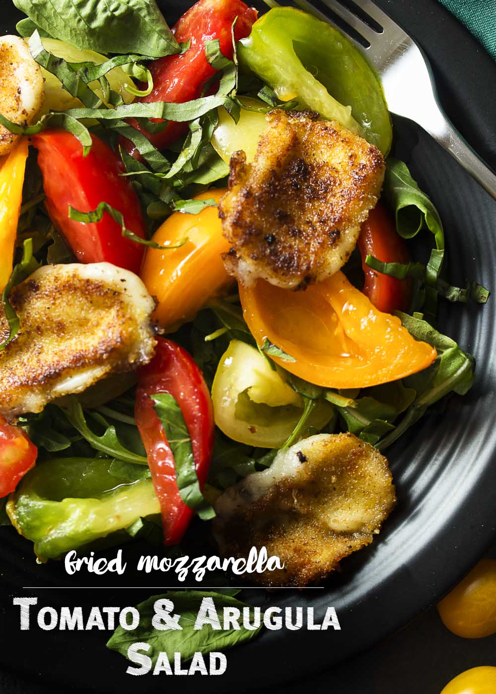 That is my kind of salad!! Love Mozzarella and arugula. I love cherry tomatoes with mine – so sweet. Love the idea of fried mozzarella.! Makes it nice and soft. yum.
