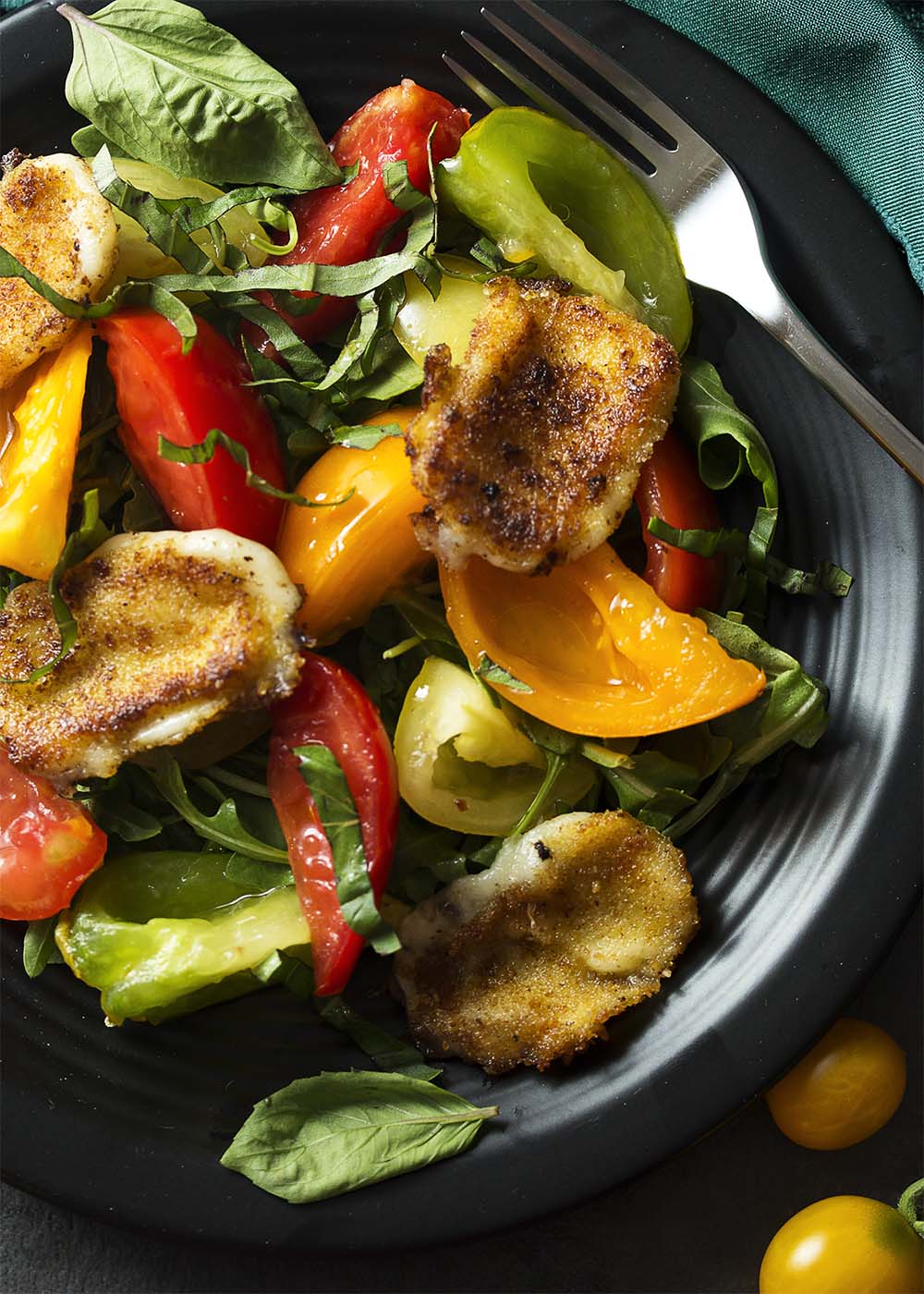 When you have fresh, summer tomatoes you have to make salads! I think it’s a rule. And an important part of the rule is that the salad be full of fresh ingredients, have plenty of flavor, and be balanced in flavors and textures. My tomato arugula salad has fresh tomatoes, arugula, and basil; layers on the flavor with a zippy dressing and by adding salt to the tomatoes; and has great contrasts among the juicy tomatoes, peppery arugula and crispy fried mozzarella.