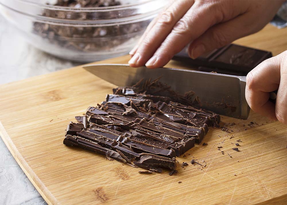 - Finely chop the bittersweet chocolate. Put the chocolate into a heat proof bowl. In a medium saucepan (one which the bowl fits over snugly), heat 1-2 inches of water until hot and steaming. Reduce the heat to low and put the bowl of chocolate over the saucepan to melt the chocolate, stirring frequently. Once the chocolate is mostly melted, move the saucepan off the heat to let the chocolate finish melting there.