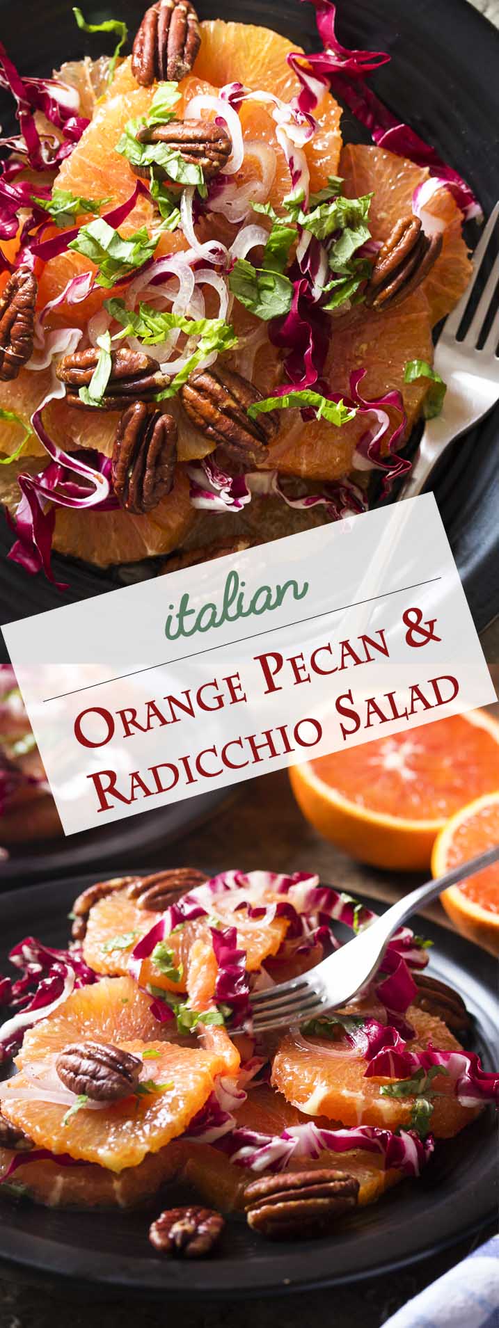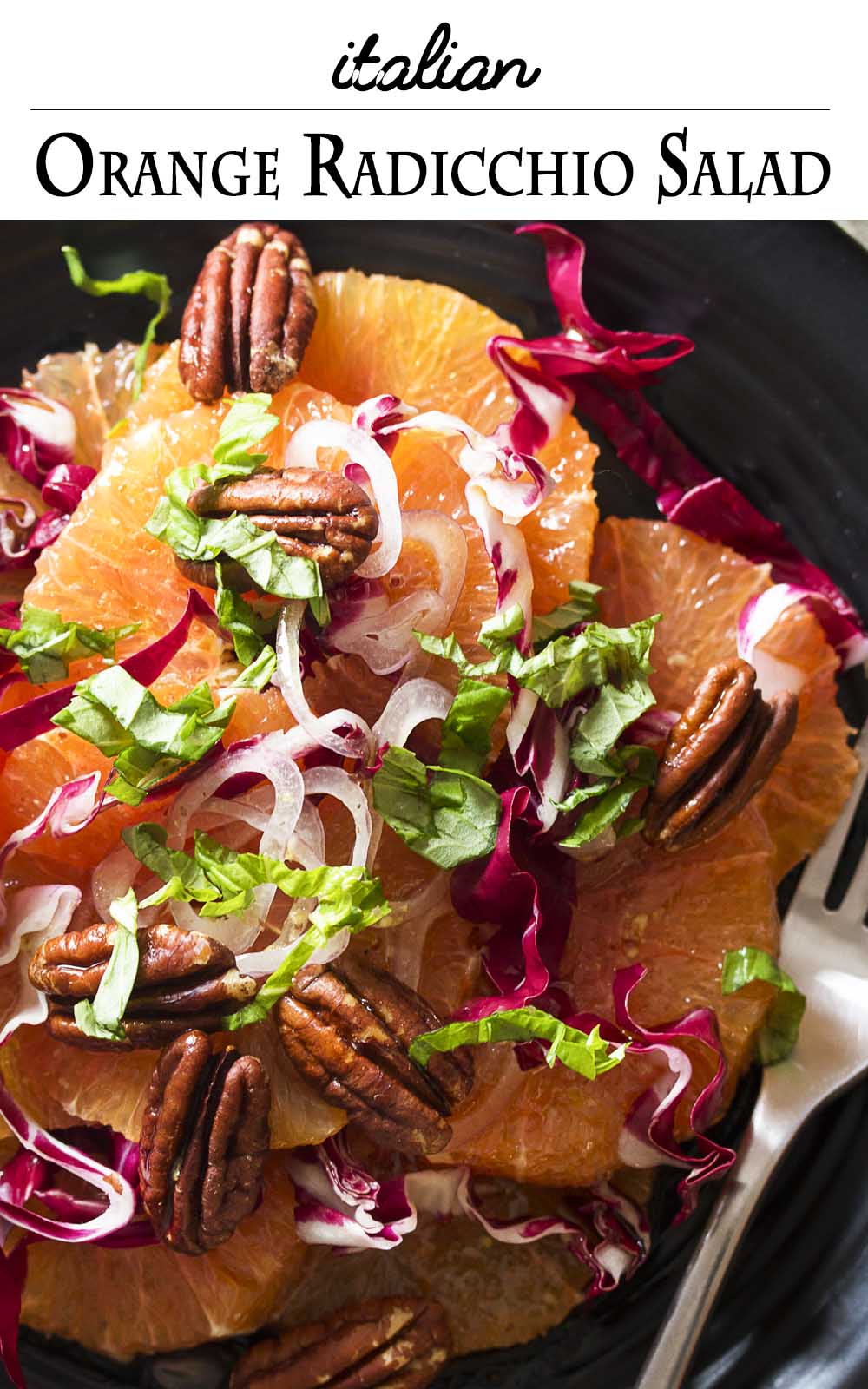 - Gently mix together the orange slices and radicchio and arrange them on a platter. Scatter the pecans, shallot slices, and basil slices over the top.