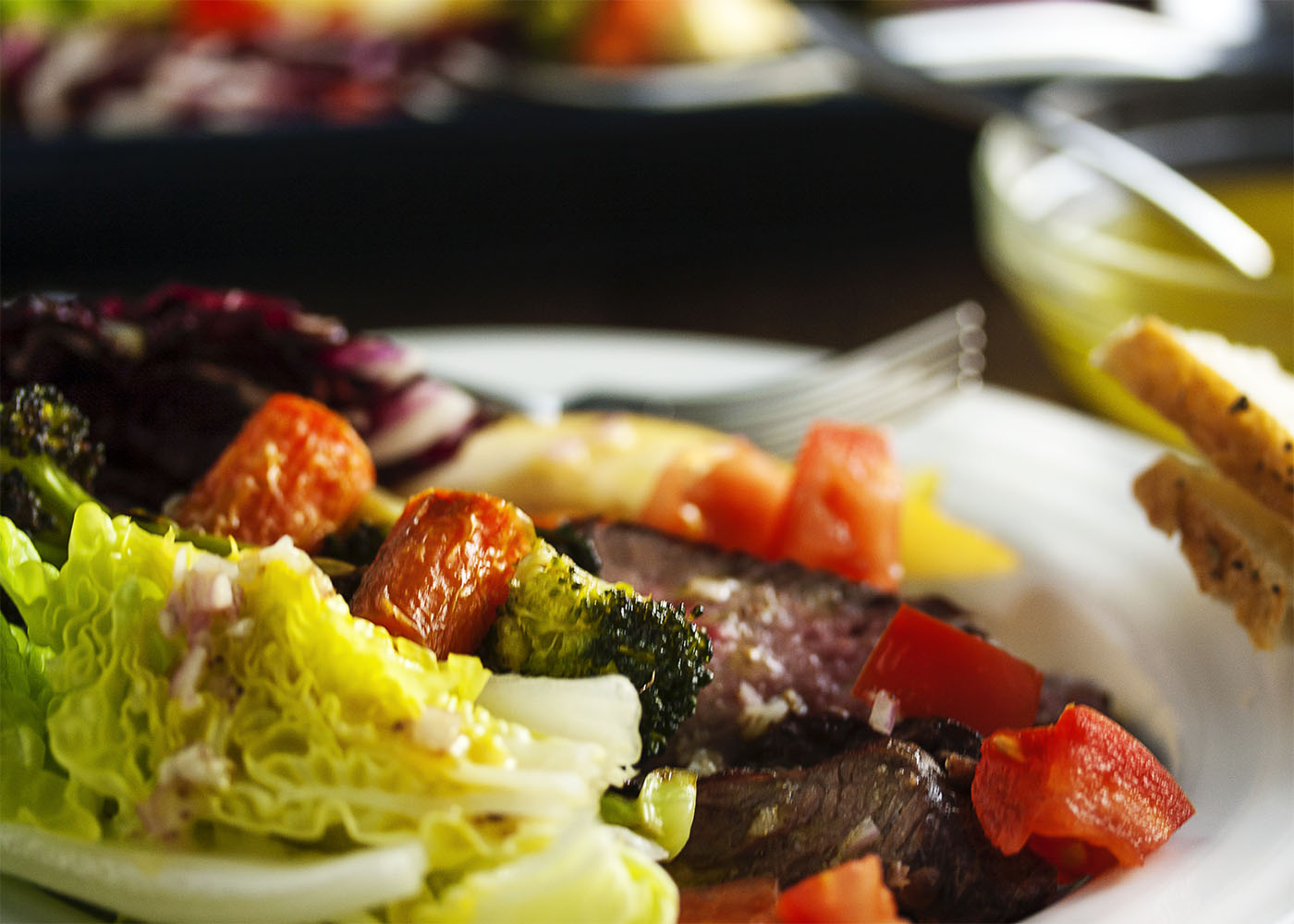 Just chop up the vegetables as needed and break or slice the meat into salad sized pieces and set it all out with some lettuce and maybe tomatoes or cucumber or sliced fruit. Then tie it all together with the vinaigrette and you have a light dinner or a nice lunch.