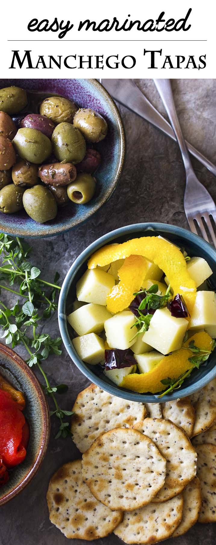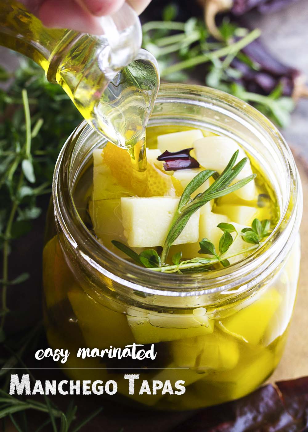 Marinated manchego is an easy recipe which takes minutes to put together and elevates a cheese platter into something special. I love this manchego tapas recipe for both its simplicity and its flavor! Whether you are doing a whole tapas spread or just putting out some cheese and olives, this is a recipe you should have in your repertoire.