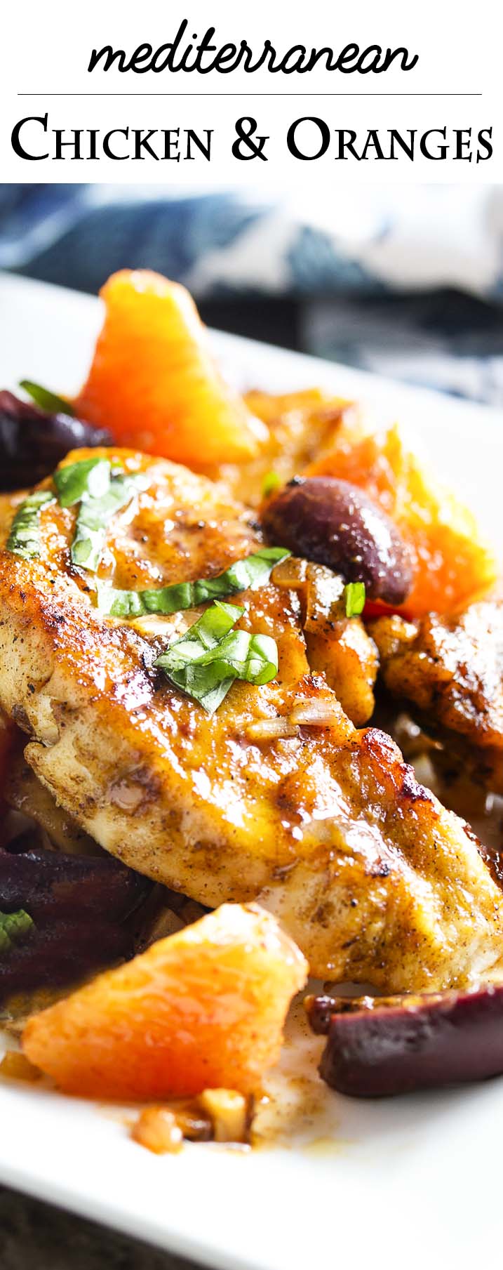 - Add the chicken back to the skillet along with the oranges and kalamatas. Toss to coat everything evenly with the sauce. Serve topped with the sliced basil.