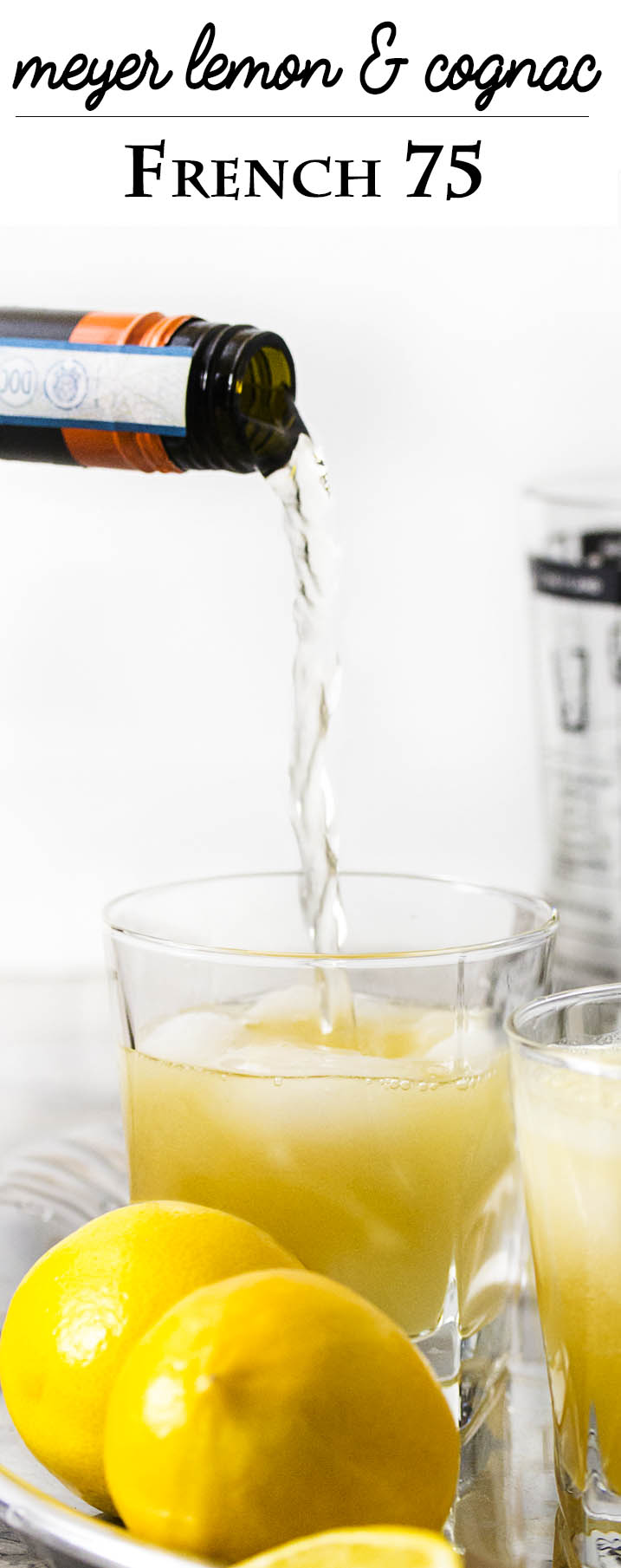 Then it needs a nice hit of citrus. Lemon is traditional, but to give it a little twist, I went with Meyer lemons, since I love Meyer lemons so much! And I thought switching out some of the cognac for Grand Marnier would be an awesome addition, bringing some orange flavors and a little more Frenchness to this French cocktail.