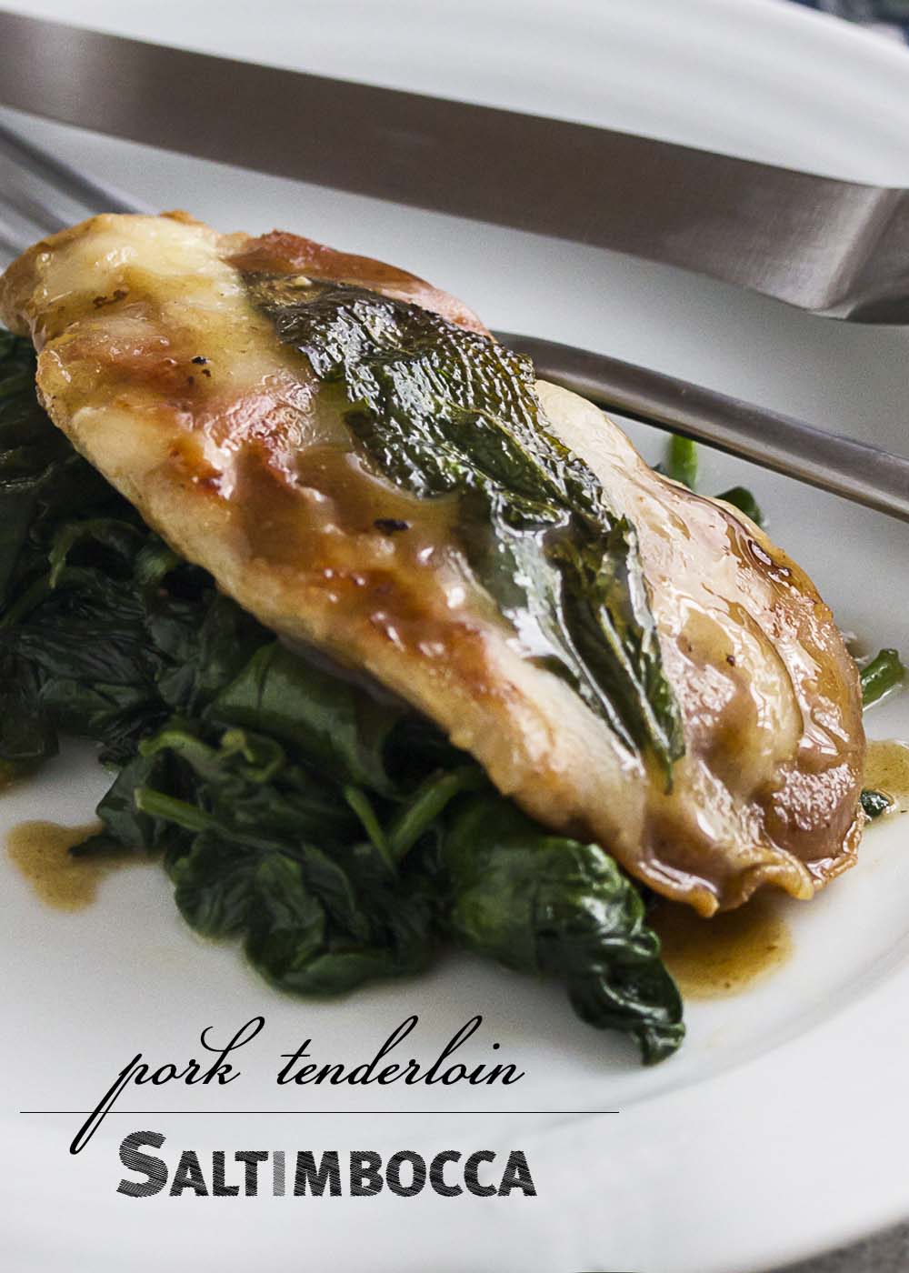 This pork saltimbocca will jump in your mouth! Pork tenderloin topped with prosciutto, fontina, and sage makes a tender and quick cooking meal. Finish off the recipe with a white wine pan sauce and serve with sauteed spinach. | justalittlebitofbacon.com