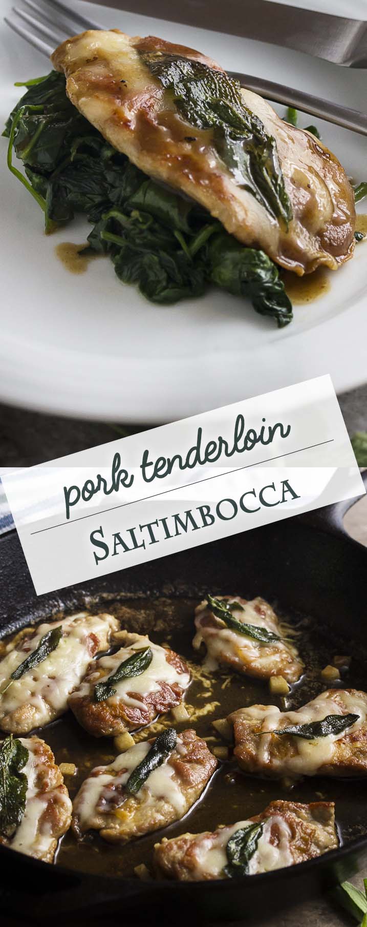 • If you are making a double batch (two tenderloins), I would highly recommend transferring the pork to a baking sheet after sauteing and let the cheese melt in the oven while you make the sauce and finish the spinach. You will heat the oven to 350, top the slices with cheese, fry up the sage then place the sage on each slice, and bake until the cheese melts, about 5-7 minutes.