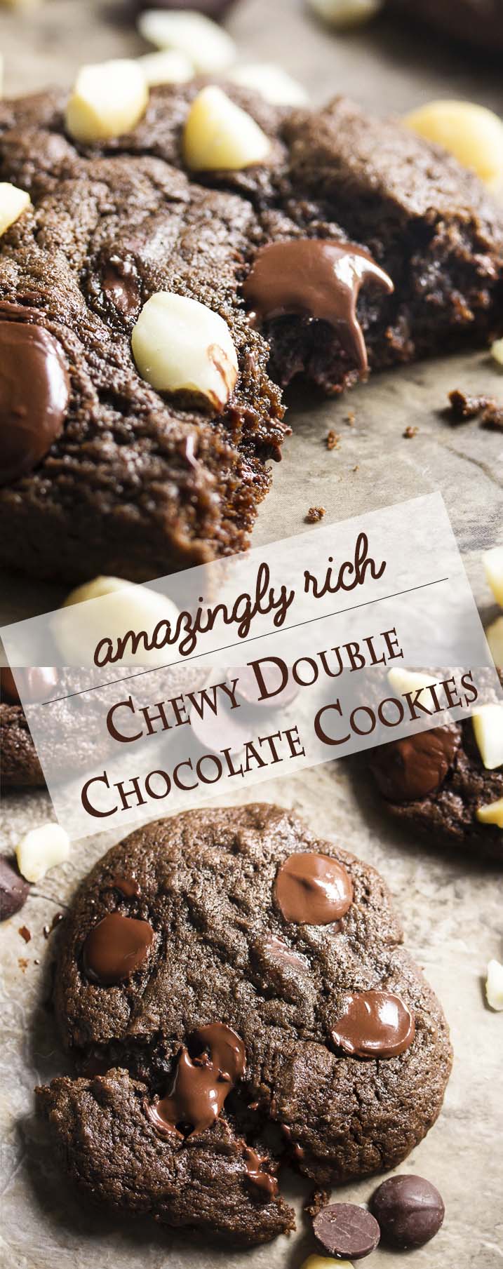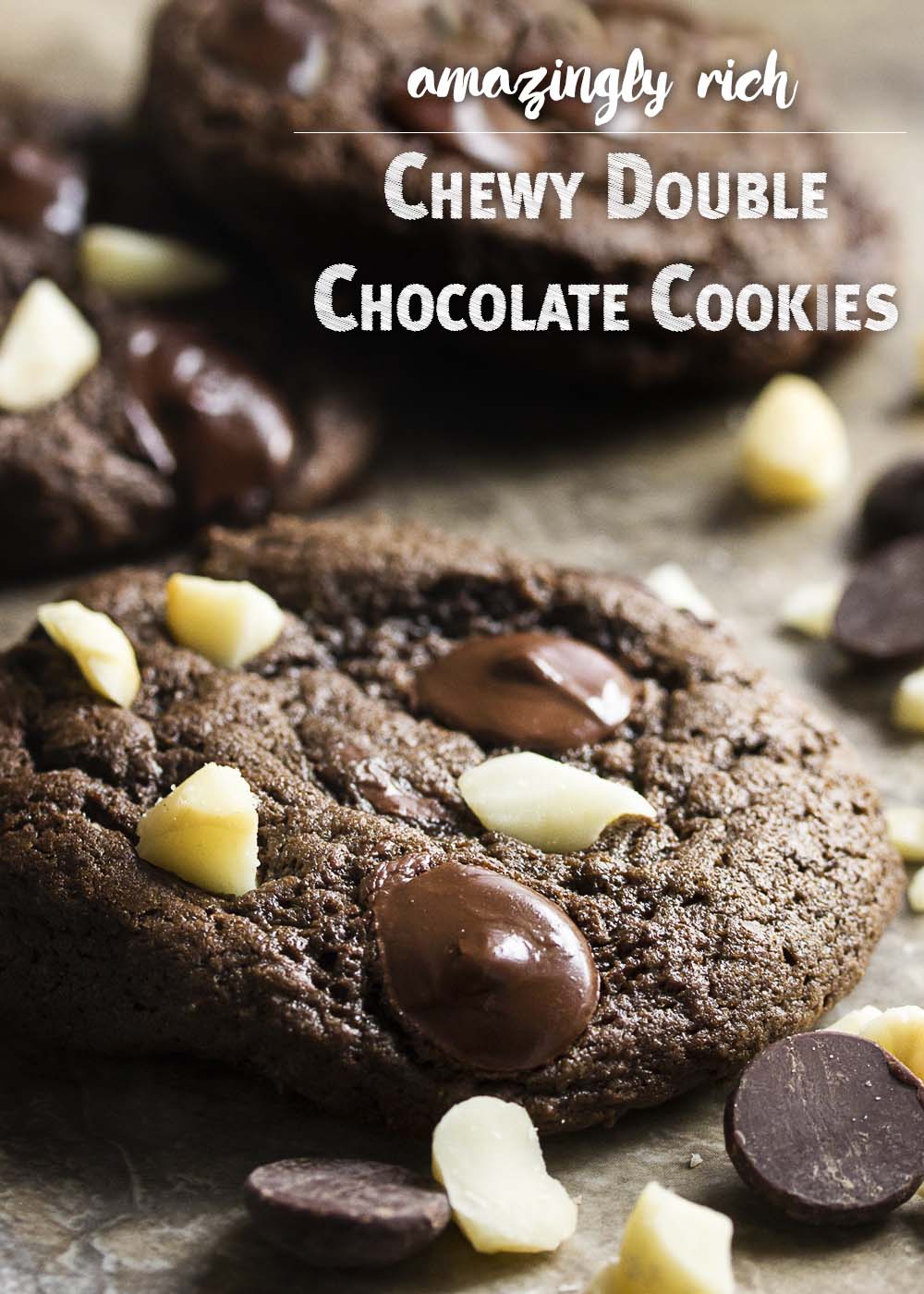 Are you looking for an intensely chocolatey double chocolate chip cookie? A cookie that spreads out and is all soft and chewy? I was looking for a cookie like that too, so I made some and now I’m sharing them with you!