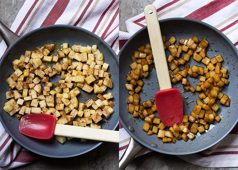 - In a nonstick skillet, melt the butter over medium heat. Once the butter is bubbling, add the rest of the ingredients. Saute the apples until they are soft and tender, 6-8 minutes.