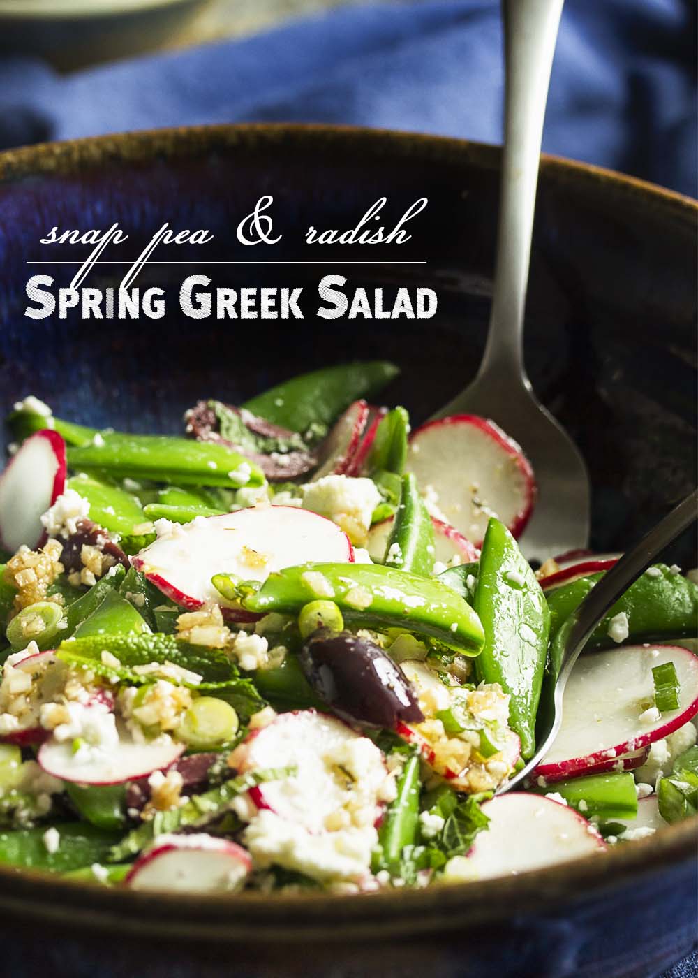 Spring is here and it’s time to enjoy this seasonal Greek salad full of juicy, sweet snap peas and spicy, crisp radishes! I just couldn’t resist making a snap pea salad and then it seemed perfect to balance them with radishes and tie it all together with great Greek flavors. Break out of your Greek salad rut, and try something a little different!