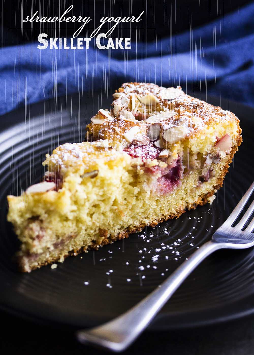 This simple strawberry yogurt cake requires only a few bowls and bakes right in your cast iron skillet! Cast iron skillets aren’t just for perfectly fried eggs and seared steaks. They have lots of other uses! Including cake. This is a use I really appreciate, especially when the cake is full of ripe strawberries, tangy yogurt, and sweet cornmeal, then topped with sliced almonds. Yum!
