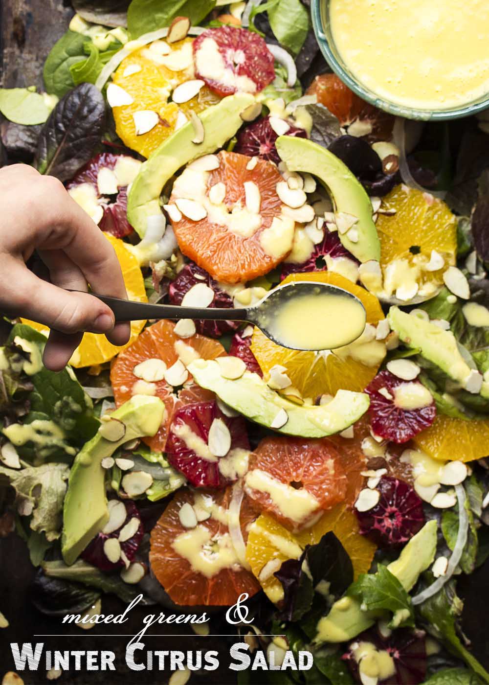 When I’m thinking about recipes and trying to decide what to make, I often flip through my old papers and notes of recipes and meals long past and see if anything strikes my fancy or inspires me. This time I came across an old note about a blender made citrus vinaigrette, which was a perfect! I’d make a sliced citrus salad over mixed greens with a dressing that used a whole orange (minus the rind) to give the most citrus-y punch possible.