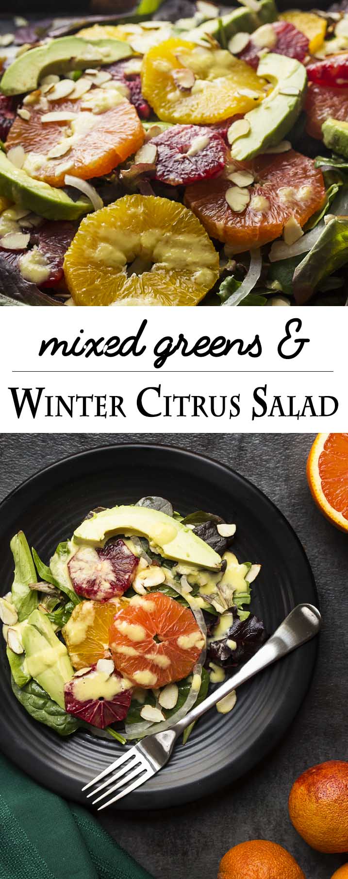 Winter citrus is out in the stores giving us warm bursts of flavor on cold and blustery days! This winter citrus salad features pale navel oranges, deep orange cara caras, and dark red blood oranges. Next time you’re out, pick up a variety of oranges, a couple of avocados, and a package of mixed greens because it’s time to make some salad!
